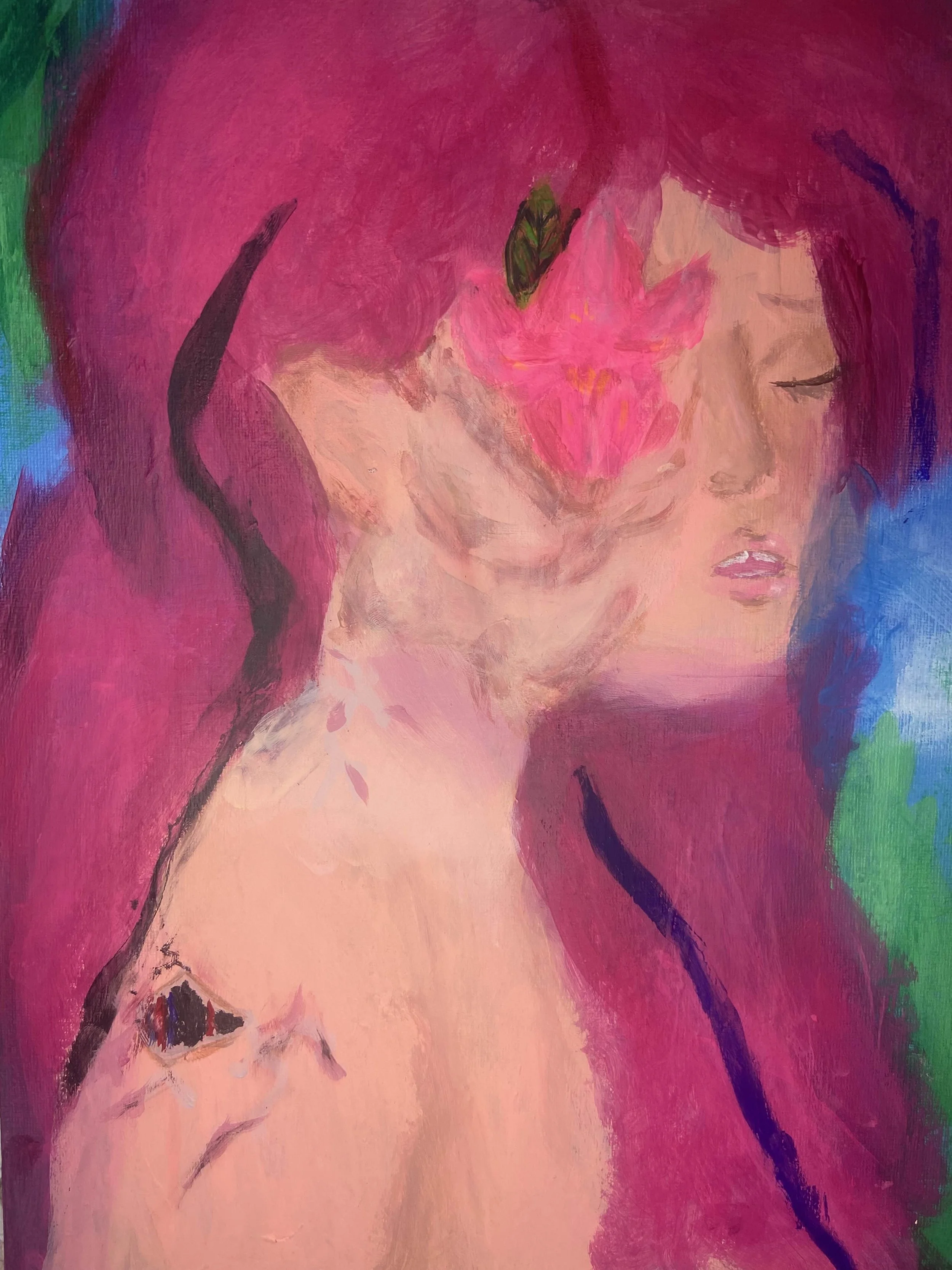 This piece was for an assignment in my Basic Painting class this past fall at Quincy College. The task was to create an expressive portrait. I chose to paint a woman where part of the skin on her face is melting off and her eye socket has an iris flower blooming out of it. She is also an android, so in this moment of pain, her wires and bits of circuitry become exposed. This piece was made with acrylic paints on 11 x 15 canvas.
