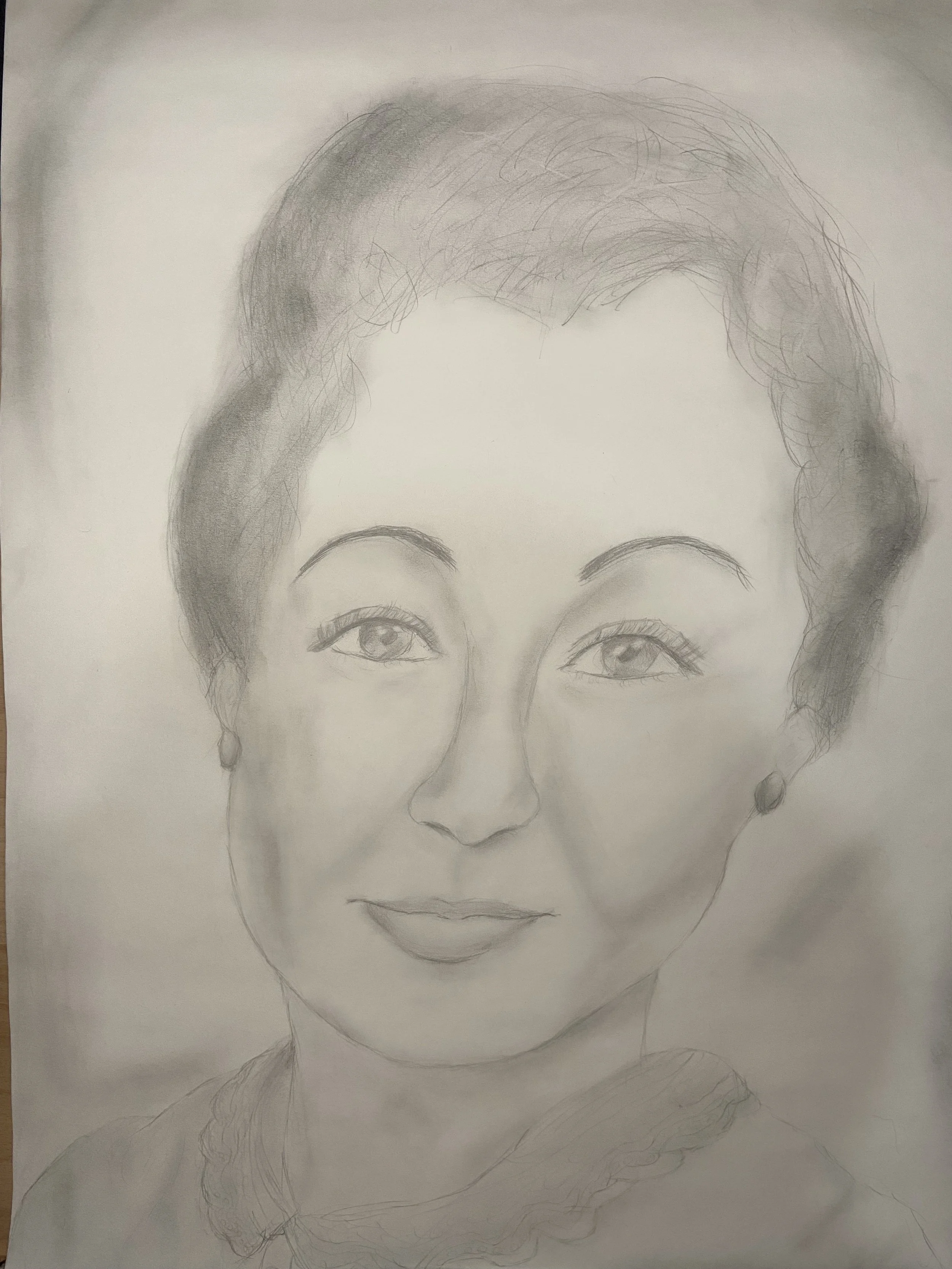 This is a portrait I did of my Nana Valerie to practice realism. We do a Yankee swap every year at Christmas time in my family (more commonly referred to as a white elephant) and I gave this away as my gift to the family. My nana Val is one of the most beloved members of our family, and her passing when I was little was hard on everyone, especially my mother. She also invented our family tradition of not only laughing at our mistakes, but sharing them with others so we can all laugh together. My mom always told me if she knew how little time she’d have with my nana when she passed, she would’ve named me after her, which is why for my online alias, I took her name as my middle name. This piece was done with pencil on 18 x 24 paper.