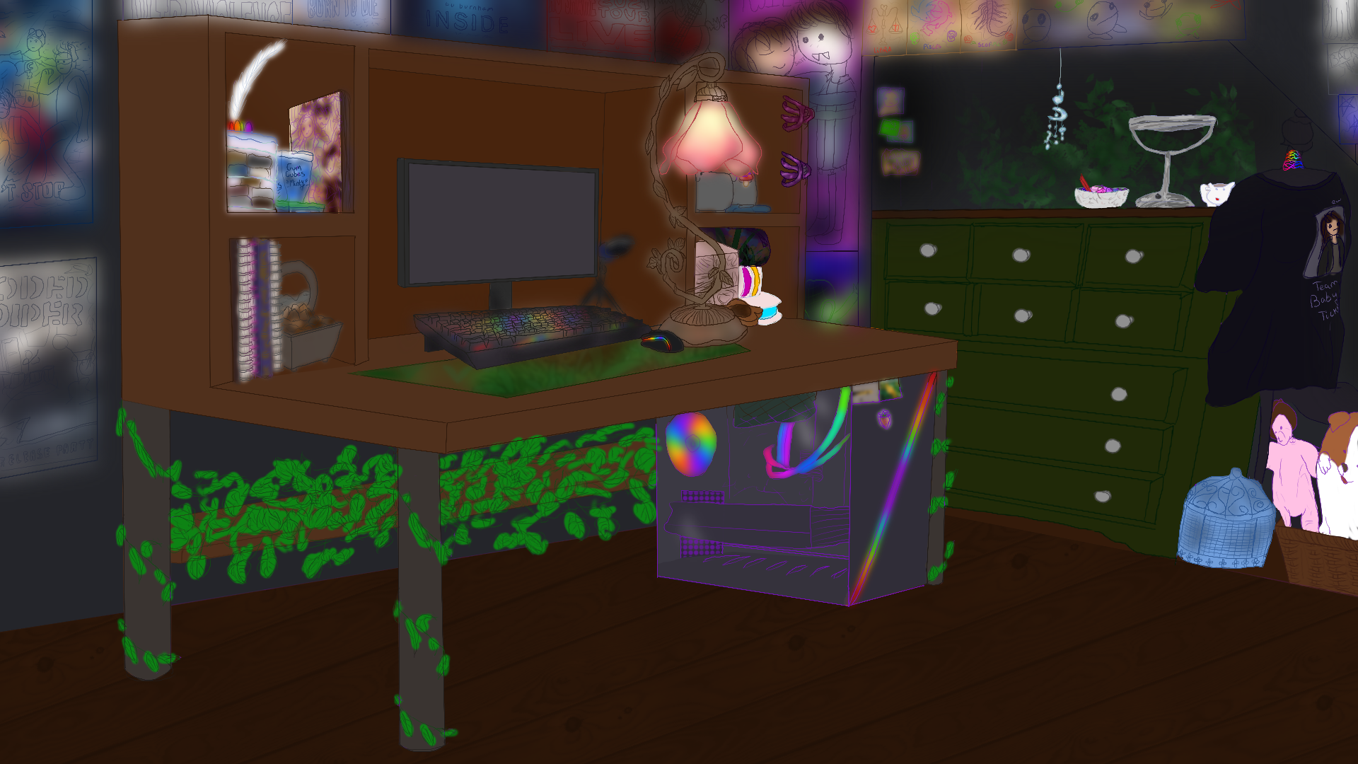 This piece was meant as a way to practice drawing backgrounds. I took a few photos of my own bedroom at the time, and illustrated it. This piece taught me the importance of perspective, and scaling items larger or smaller for more size accuracy. It also helped me realize drawing backgrounds isn’t as hard or tedious as I once thought, and just as fun as my usual illustrations!