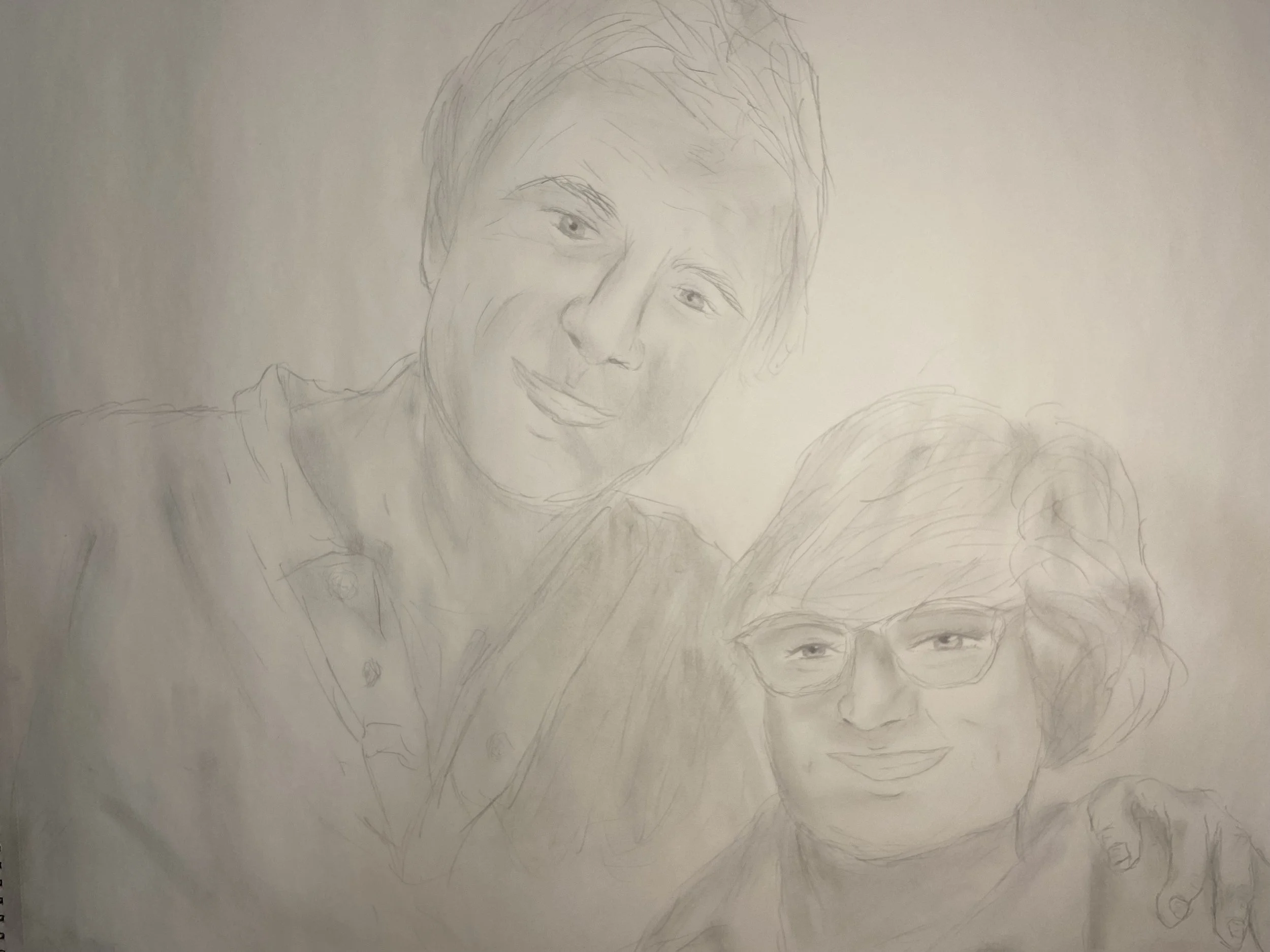 This is a piece I did as a present for my paternal grandparents. My grandma Cindy has been sick the past few years and I haven’t been able to see her as often as I used to, so I wanted to make this as not only a way of letting her know despite the fact I’m not there as often, I still love and care for her, but also as a way of saying thank you for all the support she and my grandpa Bob have given me during my time at Quincy College and moral support through my transfer application process as well even with all of the health issues their dealing with. They are two of the strongest and kindest people I know, so I made this portrait of them as a token of my thanks. This piece was made with pencil on 18 x 24 paper.
